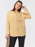 Рубашка из плотной ткани прямого силуэта. Детали: стойка по горловине, планка с застежкой на петли и пуговицы, горизонтальная широкая складка; рукав длинный, втачной со спущенной проймой, по низу рукава выполнена манжета с запахом; низ изделия асимметричный.