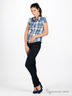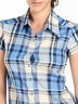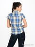 Легкая рубашка с короткими рукавами в клетку. Отложной воротник на стойке. Застегивается на планку с пуговицами. Элегантно декорирована люрексом, придающем рубашке изюминку.