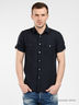 Стильная рубашка из плотного, мягкого материала. Стояче-отложной ворот. Застежка на планку с пуговицами. Короткие рукава с декоративными патами на пуговицах. На полочках два накладных кармана с клапанами на пуговицах.