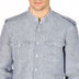 Рубашка льняная с эффектом двойки. Воротник-стойка. Планка-застежка на пуговицах. Два нагрудных кармана с клапанами. Манжеты на пуговицах. Декоративные хлястики на плечах. Внутренняя полочка белого цвета также с воротником-стойкой и застежкой на пуговицы.