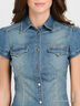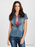 Детали: рубашечный ворот, короткий рукав, застежка на кнопки, два нагрудных кармашка, эффект потертости