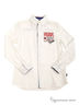 Эффектная текстильная рубашка для мальчика с оригинальной скрытой отделкой планки. Декоративным элементом, являющимся заметным украшением сорочки является шрифтовой декор на полочке и спинке, выполненный в комбинированной технике принта и линеарной вышивки.