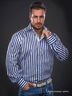 Элегантная мужская рубашка из качественной хлопковой ткани в широкую вертикальную полосу. Стояче-отложной ворот. Застежка на планку с пуговицами. Длинные свободные рукава с манжетами на пуговицах.