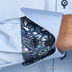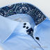 Оригинальная мужская рубашка из экологически чистого 100 % хлопка. Рубашка в стиле Casual с итальянским воротником с жесткими вставками для сохранения его формы. Удлиненный рукав с маленькой пуговицей на шлице и неаполитанскими манжетами на двух пуговицах. Для отделки внутренней стойки воротника, манжет и пуговичной планки рубашки выбрана ткань с турецким огурцом. Изысканность рубашки подчеркивают синие фирменные пуговицы Jess France формы «Diamant». Треугольный клин из ткани с узором, вшитый между полочкой и спинкой рубашки, добавляет элегантности.