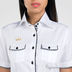 Рубашка в стиле Casual с классическим воротником с жесткими пластиковыми вставками для сохранения его формы. Короткий рукав с двумя пуговицами для регулировки застежки рукава. Для отделки внутренней стойки воротника и планки рубашки выбрана темная ткань. Полосатая ткань используется для отделки нижнего канта