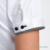 рукава, пуговичной планки и клапана накладного кармана. Изысканность рубашки подчеркивают круглые пуговицы темного цвета. Треугольный клин из однотонной ткани, вшитый между полочкой и спинкой рубашки, добавляет элегантности. Эксклюзивность рубашки подчеркивает фирменная вышивка.