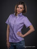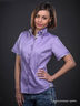 Элегантная рубашка из гладкой хлопковой ткани. Модель приталенного силуэта. Стояче-отложной ворот, концами пристегивающийся к полочкам с помощью пуговиц. Застежка на планку с пуговицами. Короткие прямые рукава.