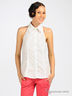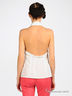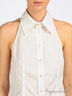 Приталенная рубашка без рукавов с открытой спиной. Отложной воротник. Застегивается на планку с пуговицами. На спинке регулируемый хлястик.