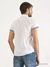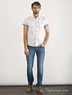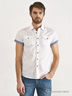 Стильная рубашка из полухлопковой, полульняной ткани. Стояче-отложной ворот. Застежка на планку с пуговицами. Короткие рукава. На полочках два накладных кармана с клапанами на пуговицах.