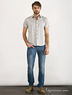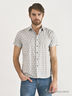 Модная рубашка из гладкой хлопковой ткани с оригинальным принтом. Стояче-отложной ворот. Застежка на планку с пуговицами. Короткие прямые рукава. Отлично будет сочетаться с разными по фасону и фактуре вещами.