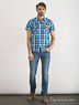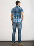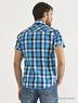 Яркая рубашка из гладкой хлопковой ткани. Стояче-отложной ворот. Застежка на планку с пуговицами. Короткие рукава с манжетами. На полочках два накладных кармана с клапанами на пуговицах.