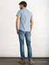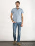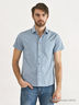 Классическая мужская рубашка из хлопковой ткани. Модель полуприталенного силуэта. Стояче-отложной ворот. Застежка на планку с пуговицами. Короткие прямые рукава. Карман на полочке.