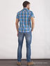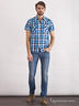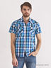 Яркая рубашка из гладкой хлопковой ткани. Стояче-отложной ворот. Застежка на планку с пуговицами. Короткие рукава с манжетами. На полочках два накладных кармана с клапанами на пуговицах.