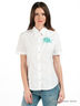 Детали: отложной ворот-стойка, короткий рукав, застежка на пуговицы, оригинальный контрастный элемент на полочке