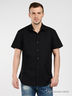 Повседневная рубашка прямого кроя. Выполнена из приятного на ощупь хб материала. Отложной воротник-стойка. Короткие рукава. Спереди застежка на пуговицы. Спинка украшена оригинальным принтом из страз.
