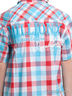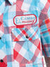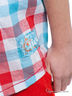Рубашка в клетку с короткими рукавами и застежкой на кнопки. 2 нагрудных кармана с клапанами на кнопках. Нашивка над карманом и внизу. Вышивка на кармане и вверху сзади. Слегка закругленный низ. Размер по росту в см.