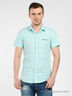 Повседневная рубашка прямого кроя. Выполнена из приятного на ощупь хб материала. Отложной воротник-стойка. Короткие рукава. Спереди застежка на пуговицы. Полочка украшена оригинальным принтом.