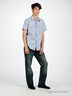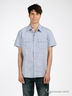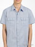 Хлопковая рубашка с коротким рукавом. Отложной воротник на стойке. Застегивается на планку с пуговицами. На полочке два накладных кармана с клапаном на пуговице.