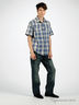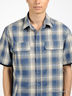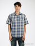 Рубашка с короткими рукавами из легкого хлопка. Отложной воротник на стойке. Застегивается на планку на пуговицах. Два накладных кармана с клапанами на кнопках. По краю рукавов трикотажные вставки с необработанными краями.