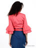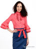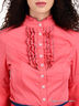 Детали: застежка на пуговицы, спинка дополнена втачным поясом, рукав три четверти с воланами, полочка декорирована оборками