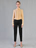 Детали: отложной воротник, застежка на пуговицы, длинный прямой рукав присборен на манжету, полочка декорирована простроченными складками
