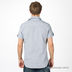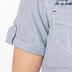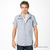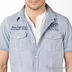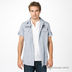 Хлопковая рубашка двойка. Нижняя часть белая, с круглой горловиной и планкой-застежкой на пуговицы. Верхняя часть полосатая, с отложным воротником на стойке, короткими рукавами с отворотами, застегивается на кнопки. Два накладных кармана с клапанами на кнопках.