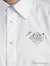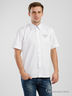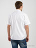 Однотонная рубашка с короткими рукавами, кокетка сзади + изнанка основания воротника в мелкую синюю клетку, принт на груди, темно-синяя отстрочка "зиг-заг" на плечах и вертикальная отстрочка сбоку слева. Складка на спинке, отстрочка по центру рукава и сзади.