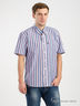 Рубашка в полоску с короткими рукавами, нагрудный карман с нашивкой. Отложной воротник, спереди центральная застежка на пуговицу.