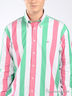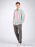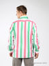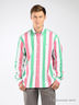 Мужская рубашка с ярким набивным рисунком. Отложной воротник на стойке. Застегивается на планку с пуговицами. Манжеты на пуговицах. Края изделия закругленные с треугольной вставкой.
