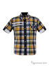 Замечательная рубашка с короткими рукавами и отложным воротником. Спереди модель дополнена застежкой на пуговицы. Изделие выполнено в яркой, контрастной расцветке в клетку. Отличный вариант для гардероба маленького модника.