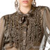 Удлиненная рубашка с поясом в мелкую клетку. Рубашка имеет длинные рукава и воротник-стойку, который переходит в декоративные хлястики, завязывающиеся на бант. Украшением является многочисленные рюши вдоль планки.