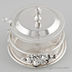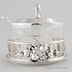 Сахарница с ложечкой в обрамлении металла с серебряно-никелевым покрытием богато декорирована цветочным узором и тонко выполненными деталями в виде стилизованных растений.