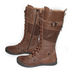 Высокие сапоги из коричневой кожи с укрепленными мысами, боковой молнией и фронтальной шнуровкой. Декорированы пряжками.
