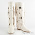 Стильная модель осенних сапог из натуральной кожи очень мягкой выделки. Обувь выполнена в белом цвете. Удобная колодка. Высокие голенища с фигурной перфорацией, металлическими клепками и бахромой. Плоская подошва. Внутренняя часть изделия, стелька и подметка выполнены из натуральной кожи.