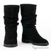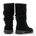 Стильные велюровые сапоги на плоской подошве с голенищем 3/4. Модель без застежки. Внутренняя нижняя часть изделия дополнена натуральным мехом, голенище дополнено байковой подкладкой (еврозима). Прорезиненная подошва с небольшим протектором.