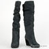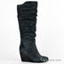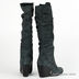 Стильные кожаные сапоги на танкетке с высоким голенищем. Прорезиненная подошва с неглубокими протекторами приклеена к основанию изделия. Подкладка и стелька выполнены из натурального меха, голенище из войлочной ткани. Средний подъем.