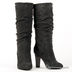 Стильные велюровые сапоги на устойчивом каблуке с голенищем 3/4. Модель без застежки. Байковая подкладка. Прорезиненная подошва с небольшим протектором.