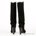 Сапоги женские из натуральной мягкой замши. Округлый, слегка заостренный закрытый мысок. Тонкая подошва черного цвета соединена с изделием клеевым способом крепления. Высокий устойчивый каблук черного цвета с набойкой. Подкладка из кожи.