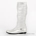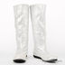 Сапоги женские из натуральной кожи серебристого цвета обработанной лазером. Стильная форма. Округлый мысок. Тонкая литая подошва с протектором соединена с изделием клеевым способом крепления. Подкладка из натурального меха цигейка белого цвета.