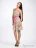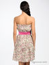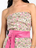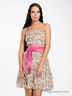 Легкое платье из хлопка расклешенного кроя. Наверху фиксируется резинкой. Отрезной низ с рюшей. В комплект к платью идет яркий атласный пояс.
