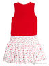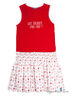 Сарафан с заниженной линией талии с поясом-резинкой построен на комбинации однотонного полотна и орнаментального. На полочке лаконичный шеврончик.