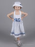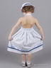 Расклешенный сарафан с хомутиком, застегивающимся на пуговицы на шее. Низ юбки украшен атласными лентами и оборкой из белого шитья. На талии декорирован цветками и лентами.