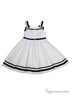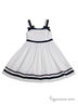 Расклешенный сарафан на бретелях. Выполнен из мягкой хлопковой ткани и декорирован атласными лентами по бретелям, поясу и низу юбки На лямках украшен бантиками, на груди фирменная надпись из страз. Застегивается сзади на пуговицы.