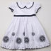Расклешеный сарафан с отложным воротничком и коротким рукавом-фонариком. Застежка на спинке на пуговицы. Пришиты ленты, завязывающиеся на спинке. Подол декорирован.