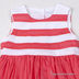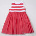 Расклешеный сарафан на широких лямках застегивается на пуговицы на спинке. Лиф в контрастную полоску. По боковым швам пришиты ленты, завязывающиеся на спинке.