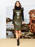 Эффектный сарафан из гладкой искусственной кожи. Полочка изделия выполнена с имитацией функциональной планки с пуговицами. Бретели дополнены рюшами. Застегивается змейкой на спинке. Изделие подойдет обладательницам типов фигуры «груша», «прямоугольник», «песочные часы».