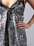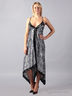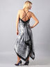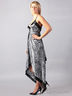 Броский шелковый сарафан на тонких бретелях. Спина открыта, под грудью завязки, длина юбки разная.