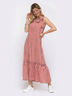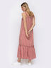 Длинный сарафан из жатого хлопка в полоску на завязках. Горловина присобрана на эластичную тесьму с рюшей. Снизу изделие дополнено широким воланом. Для удобства по бокам предусмотрены карманы.