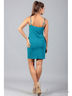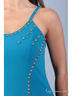 Детали: короткое платье на бретелях, область груди украшена золотого цвета кнопками, лямки украшены камнями и переплетены, форма юбки - карандаш.
