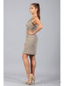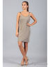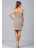 Детали: короткое платье на бретелях, область груди украшена золотого цвета кнопками, лямки украшены камнями и переплетены, форма юбки - карандаш.